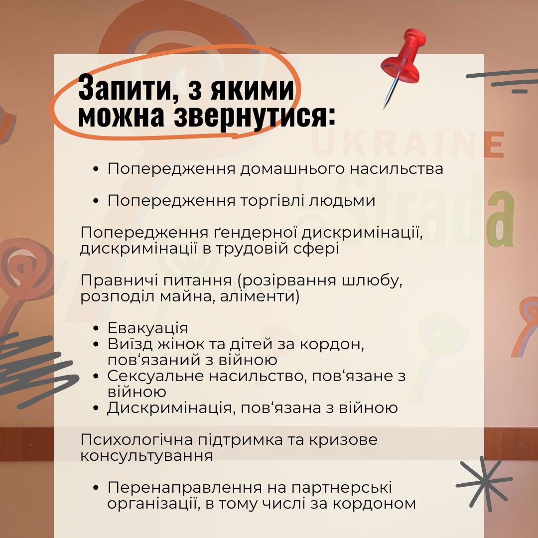 Громадська правозахисна організація, яка працює для забезпечення ґендерної рівності, миробудування, запобігання ґендерно зумовленому насильству , зокрема, домашньому насильству, протидії торгівлі людьми та забезпечення прав дітей, сприяючи впровадженню стандартів прав людини в усіх сферах життя суспільства та держави.