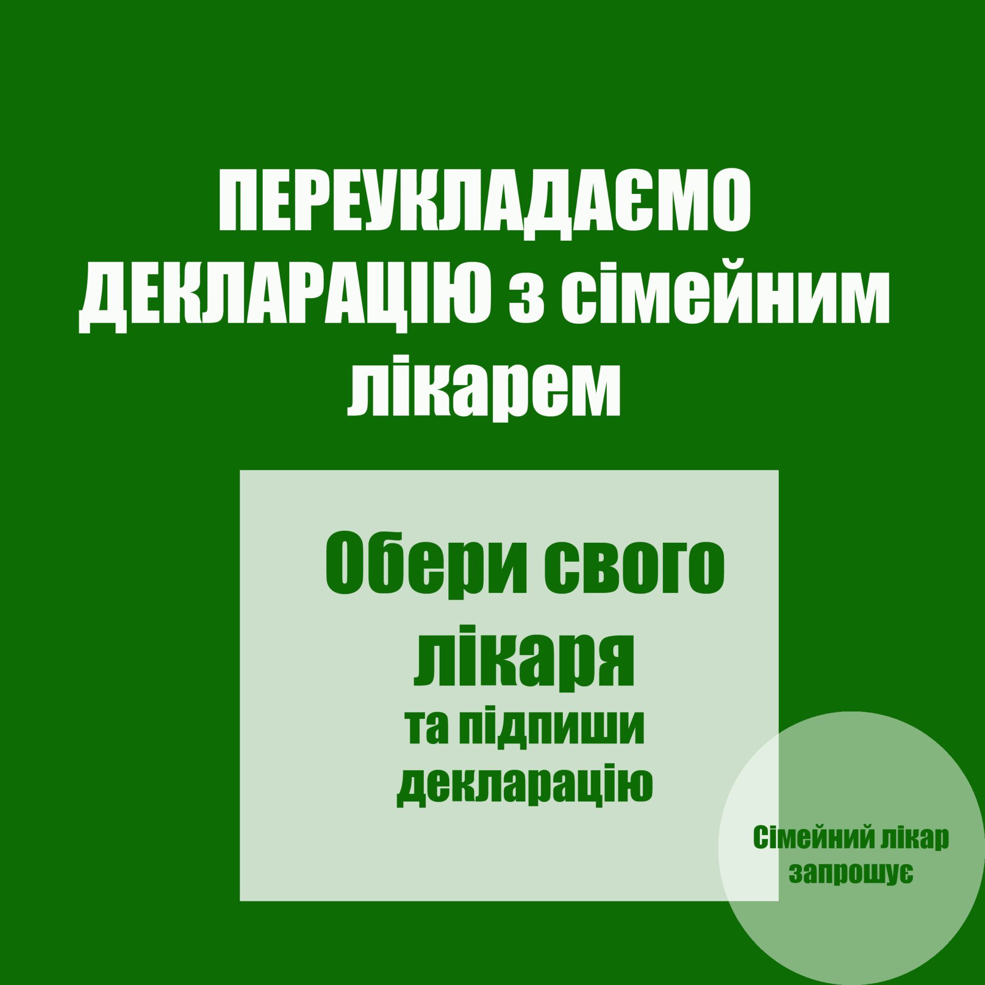 Шановні пацієнти! У зв’язку зі змінами, що відбулися у законодавстві, запрошуємо зв’язатися зі своїми сімейними лікарями для оновлення данних у Деклараціях.