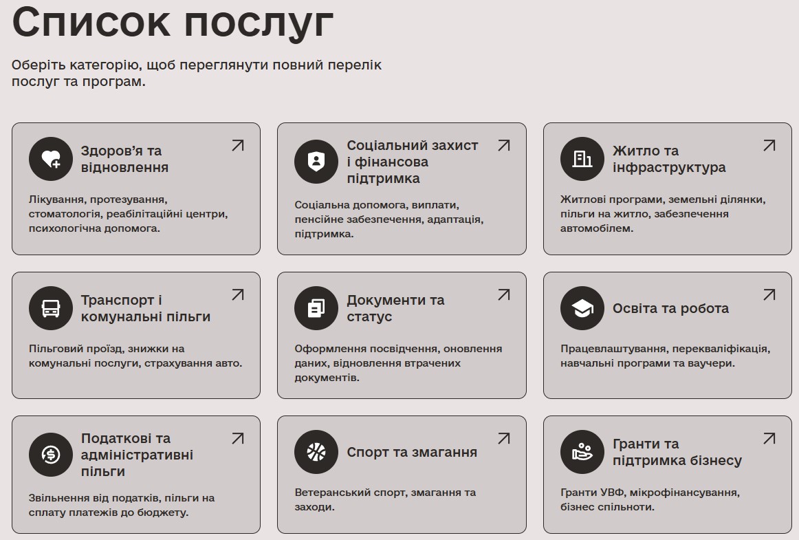 Кожен блок містить описи послуг, зрозумілі інструкції «як отримати», посилання отримання послуги та додаткова інформація.