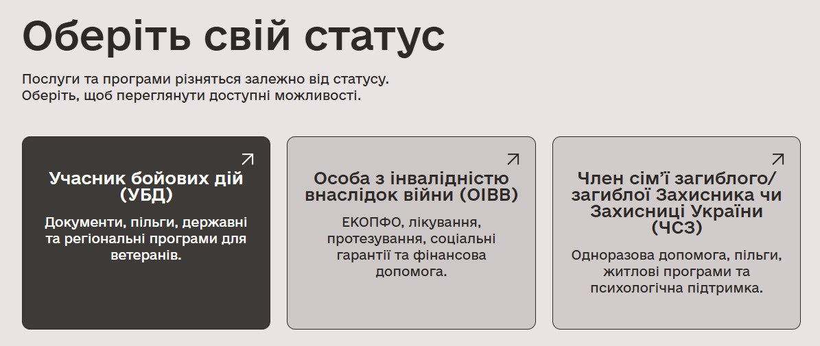 - Обрати статус (ветеран/ветеранка, особа з інвалідністю внаслідок війни, член родини загиблого/загиблої);
