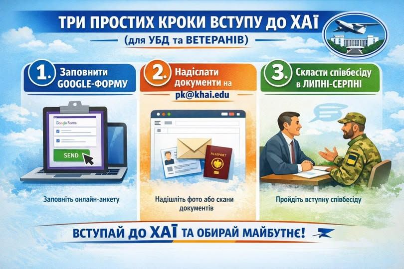 Надішліть документи на email: pk@khai.edu (паспорт, витяг з реєстрації, документ про освіту, посвідчення УБД, ідентифікаційний код).